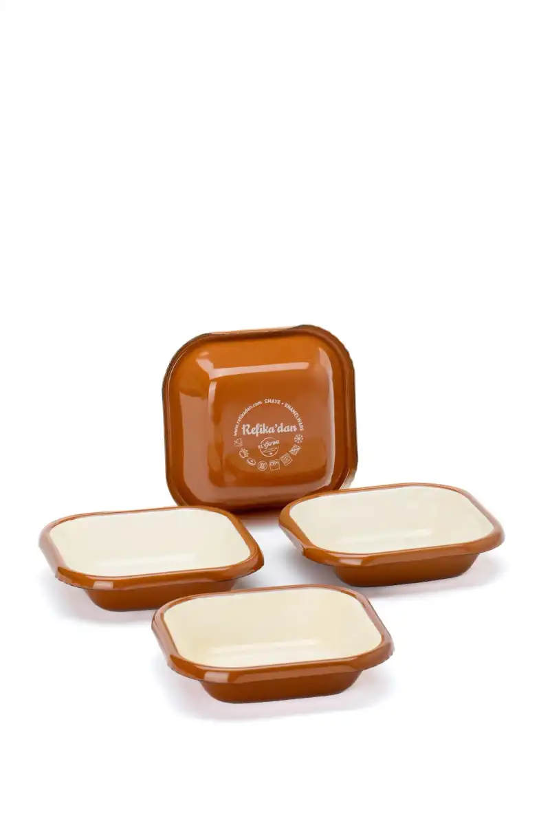 Tarçın kordonlu emaye kare kase seti 4lü, modern sofralara uygun dekoratif sunum seti