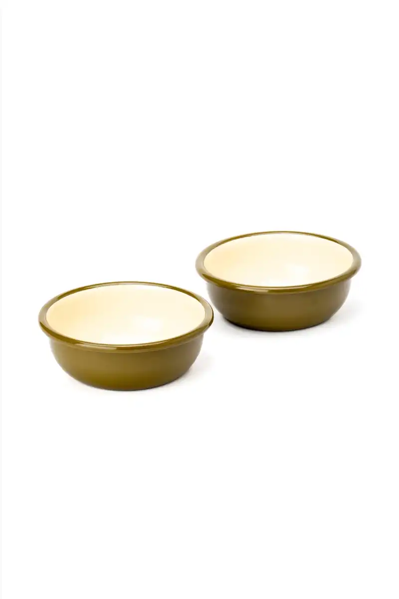 Haki kordonlu emaye küçük kase seti 2li, kahvaltı sofrası ve meze sunumu için vintage set