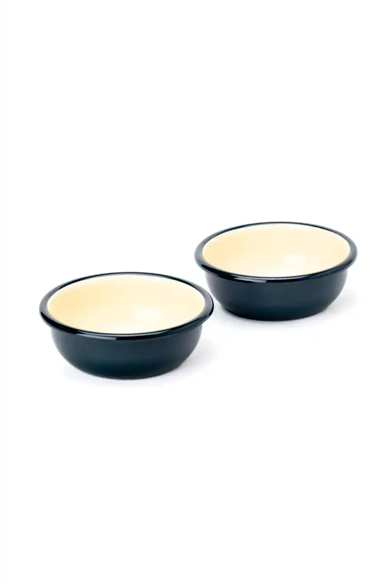 Petrol kordonlu emaye küçük kase seti 2li, kahvaltı sofrası ve meze sunumu için vintage set
